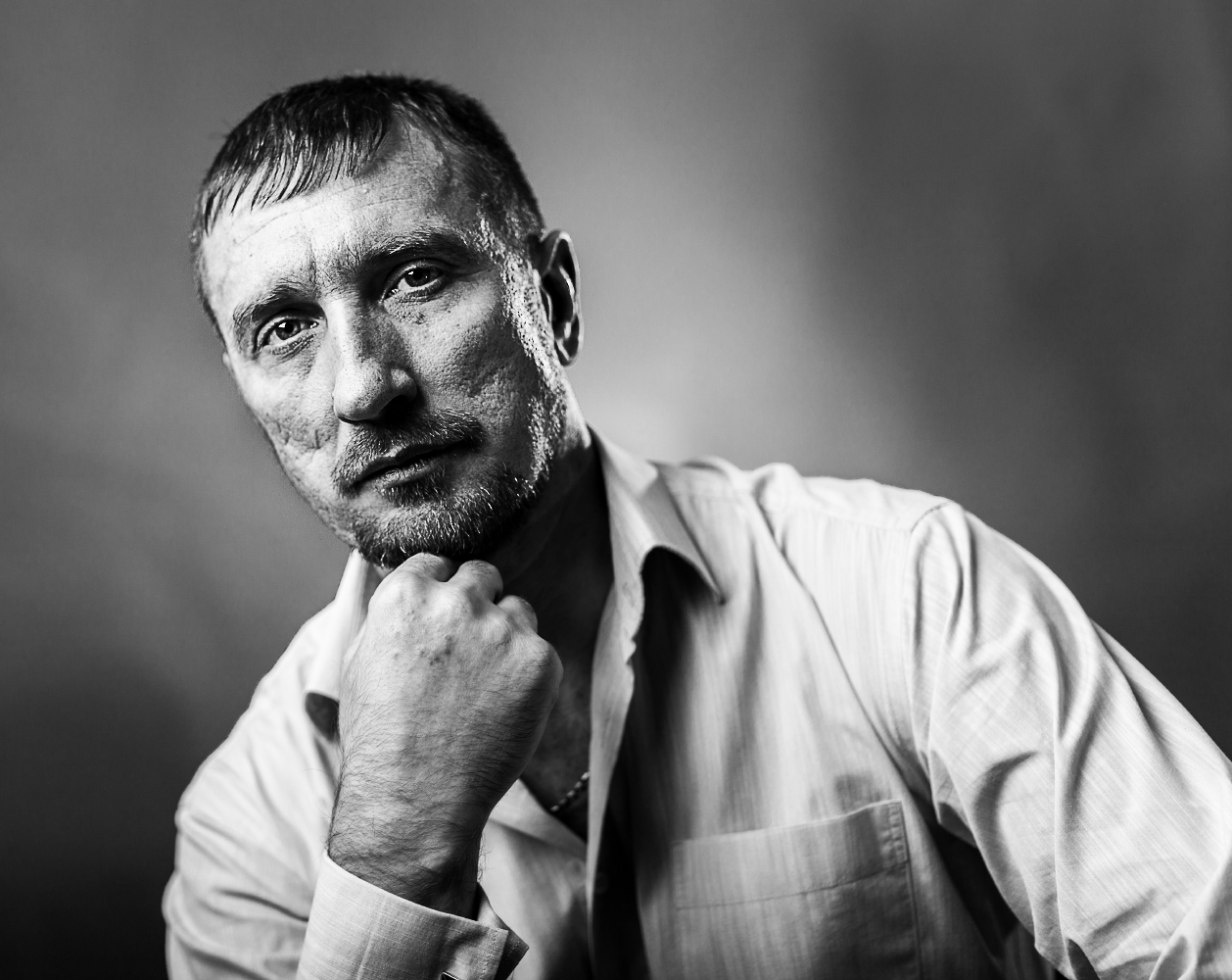 чрезмерная резкость на лице и чуть затемнить рубаху, и будет здорово. в любом случае более выигрышно чем в цвете